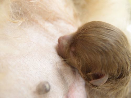 手術をして赤ちゃんを取り上げるのは私ですが、その他にも麻酔管理者と助手、そして、取り上げた赤ちゃんを蘇生するスタッフが必要です。胎膜を丁寧にはずし、胎盤をはずし、臍帯を切って、羊水をはかして呼吸を始めさせます。このとき「キュー、キュー」と元気に泣き出すまでは安心できません!。なかなか泣かない場合は一生懸命マッサージします。原則として1頭につき1人が担当します。ですから多頭になればなるほど人数が必要となるわけです。今回も無事生まれ、元気よくおっぱいを吸いだしました↓
